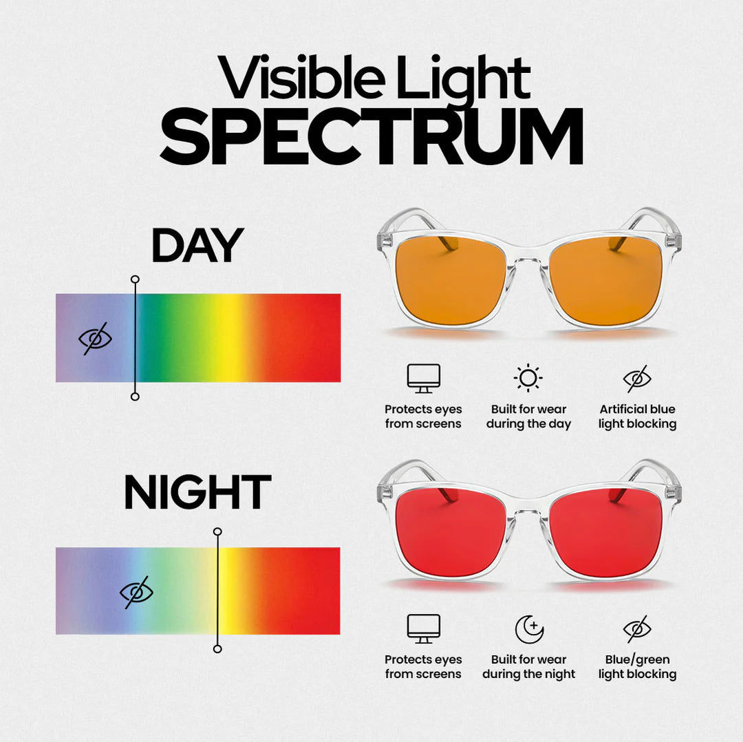 Orange lenses keep your eyes fresh, sharpen focus, and stop daytime fatigue from screen glare.