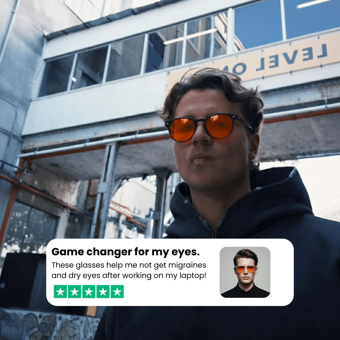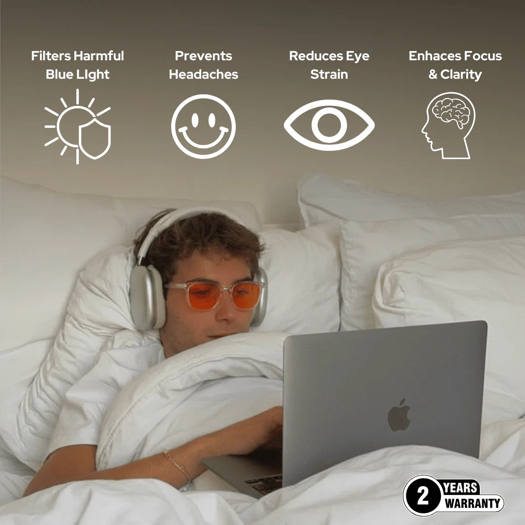 Orange lenses keep your eyes fresh, sharpen focus, and stop daytime fatigue from screen glare.