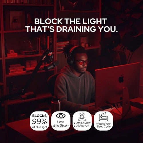 Our Red Lens glasses block 99% of blue and green light (400–520nm), shielding your eyes from the harsh wavelengths that cause strain, headaches, and fatigue.